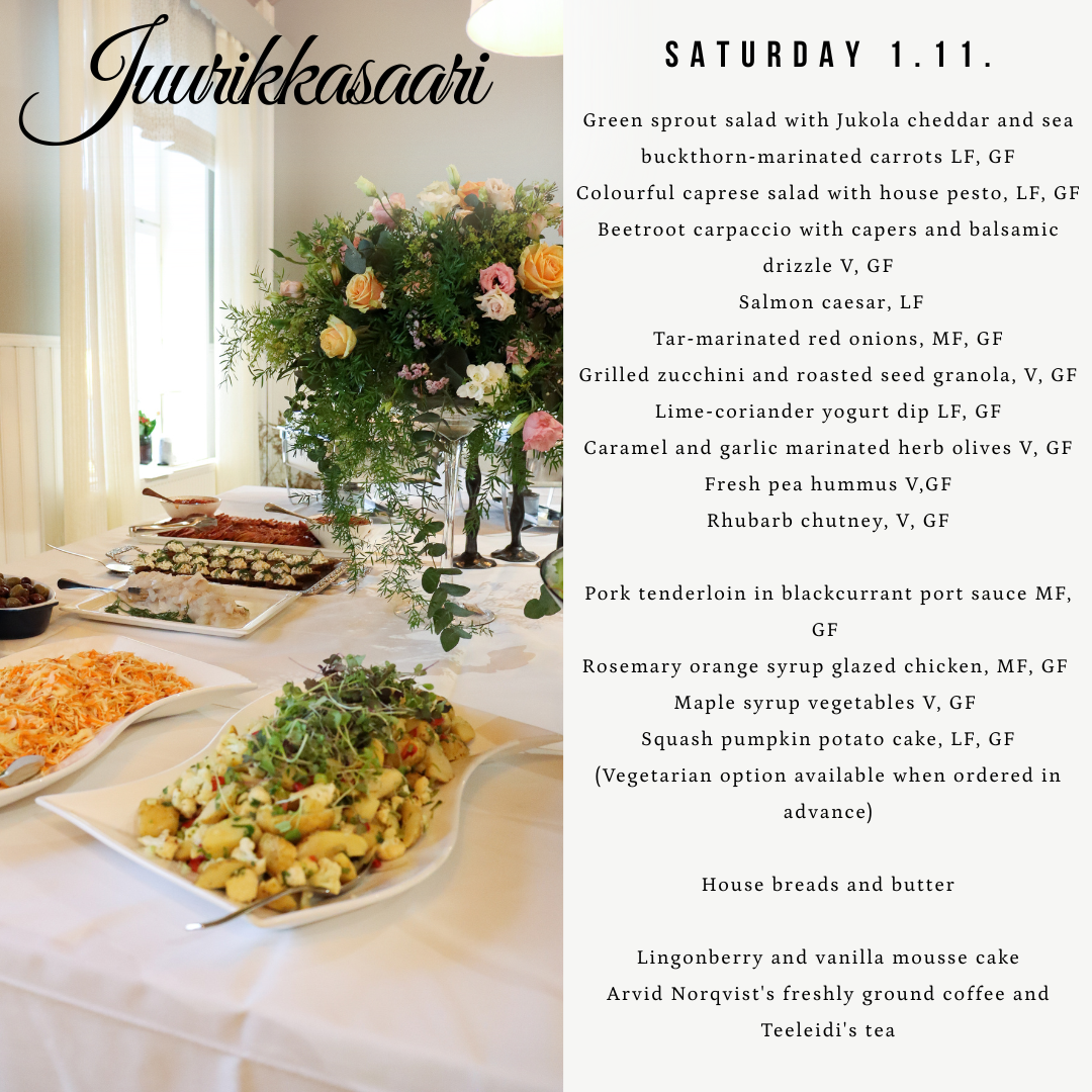 For all Saint’s day lunch please reserve a table in advance either by E-mail myynti@juurikkacatering.fi or by phone 050 595 7470 / Pasi Keinonen