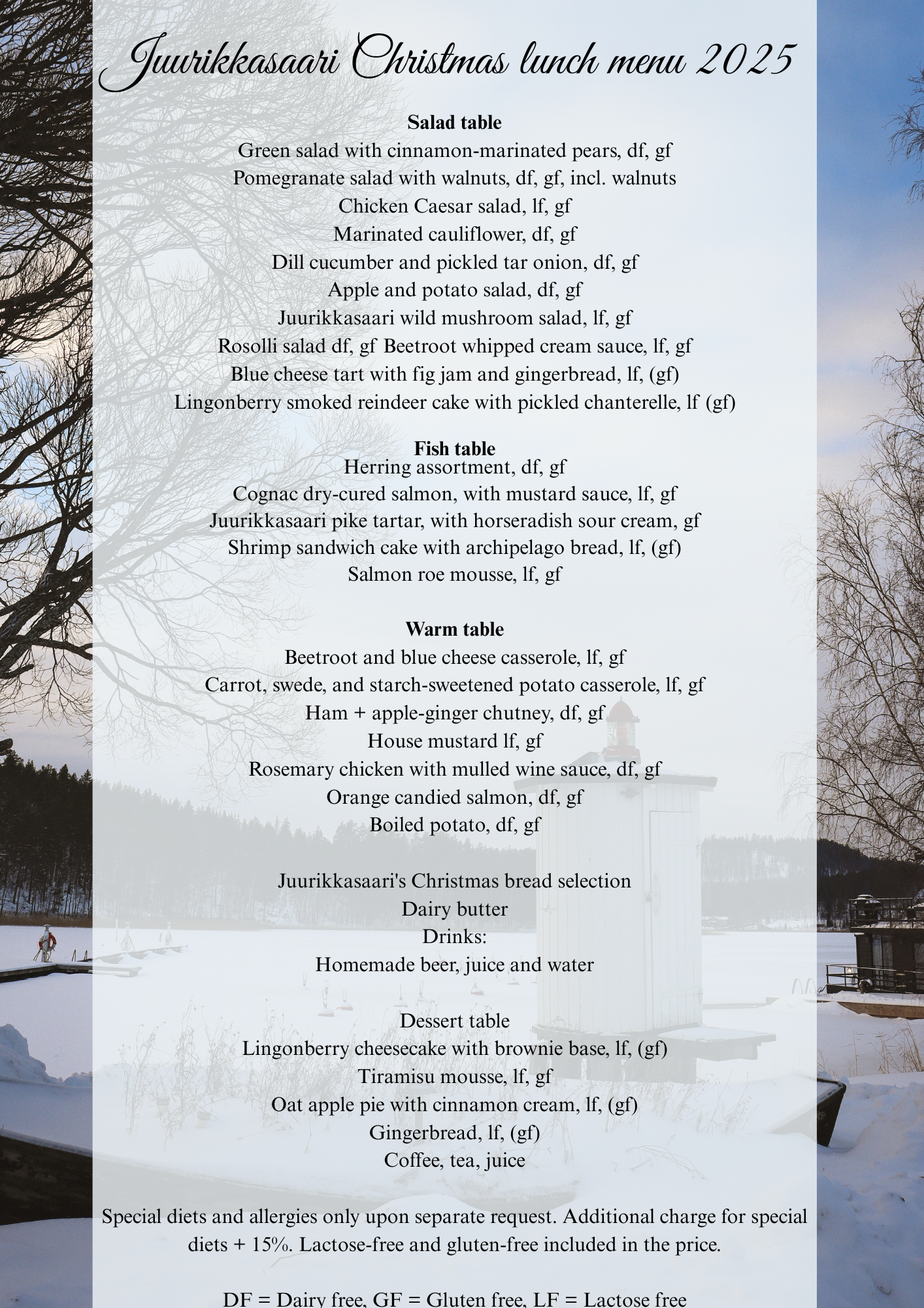 Special diets and allergies only upon request. Additional charge for special diets + 15%. Lactose-free and gluten-free included in the price. Please tell of any dietary restrictions when booking a table.
