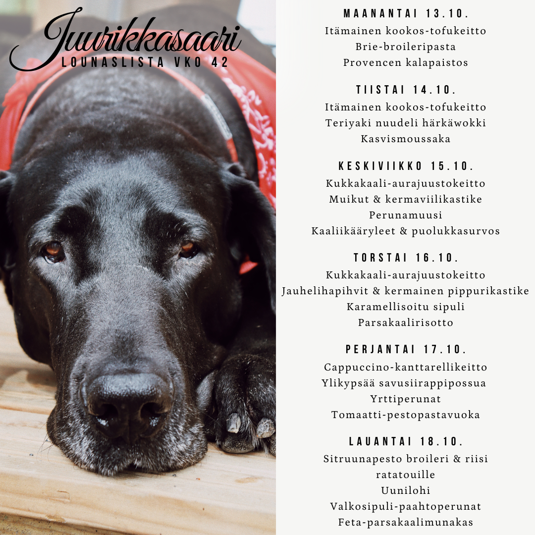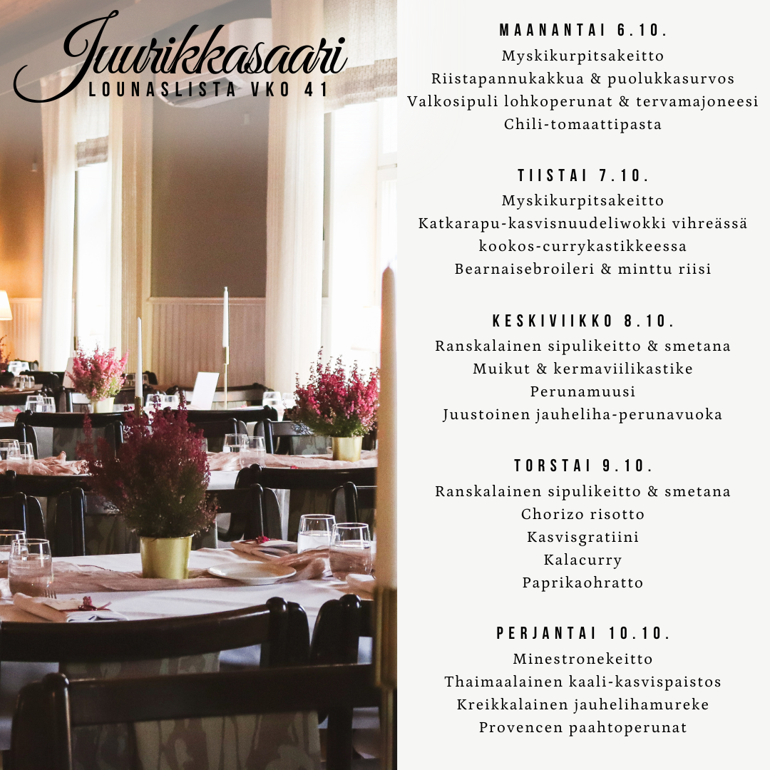 1.11. Pyhäinpäivä lounas, 35€/hlö Lapset 1-12v 2€/ikävuosi (Vaatii pöytävarauksen) Lisätietoa täältä!